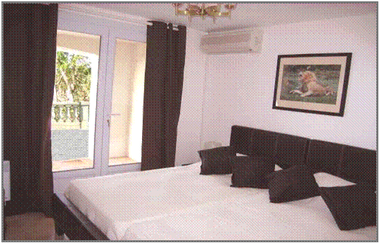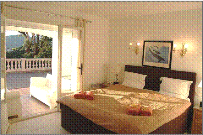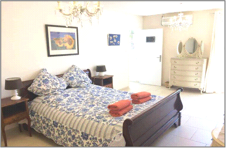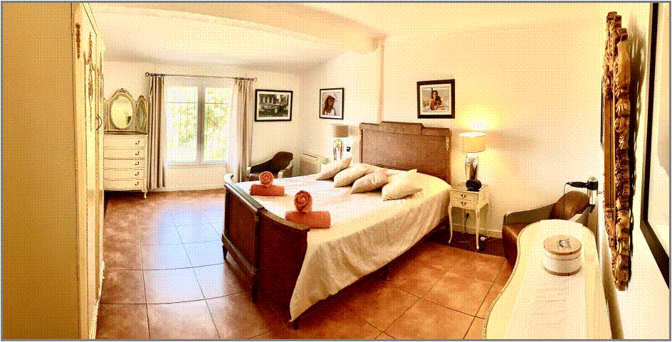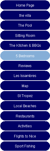 Bedroom 1: The Walnut Suite The master bedroom has a king size 150 year old Walnut double bed, air-conditioning, a dresser, a wardrobe and a chest of drawers, beside tables, lamps., chrome and leather chairs and a lovely view over the garden and the hillside towards the gulf of St Tropez |
